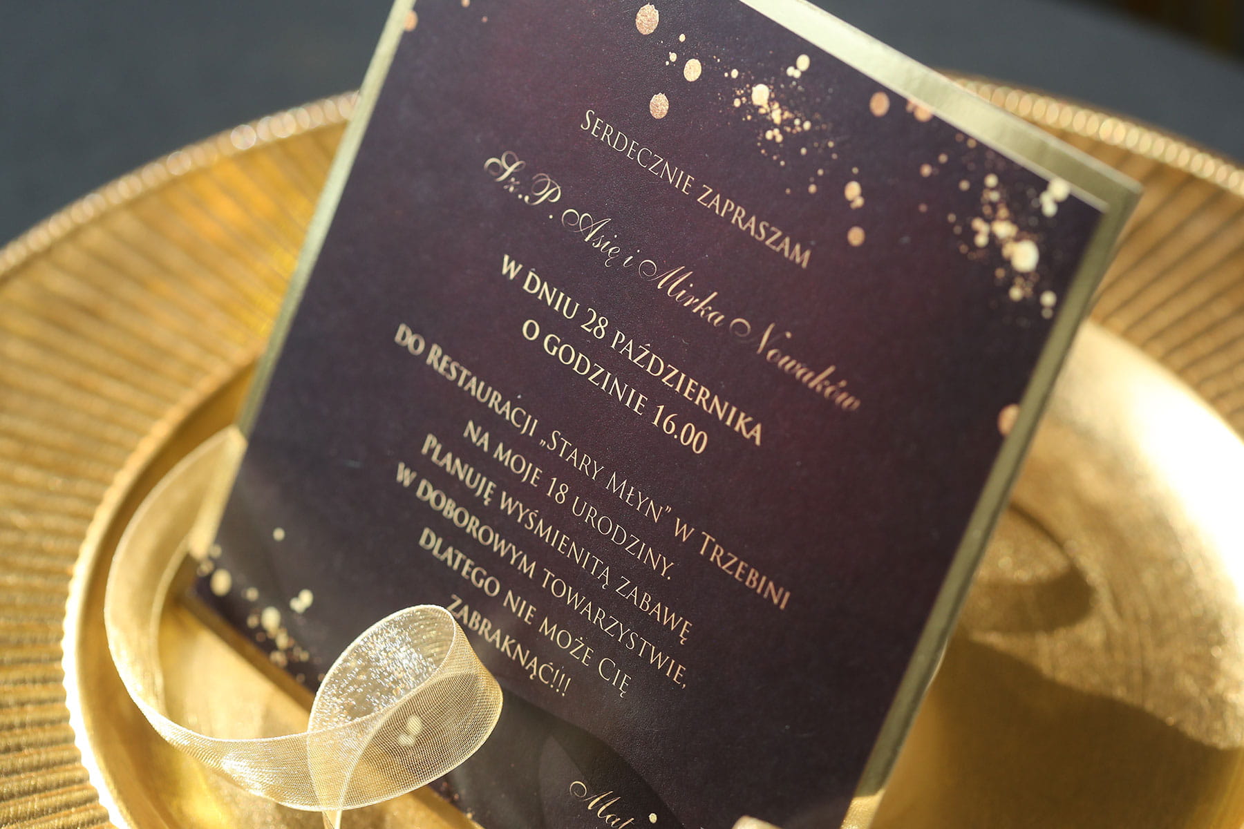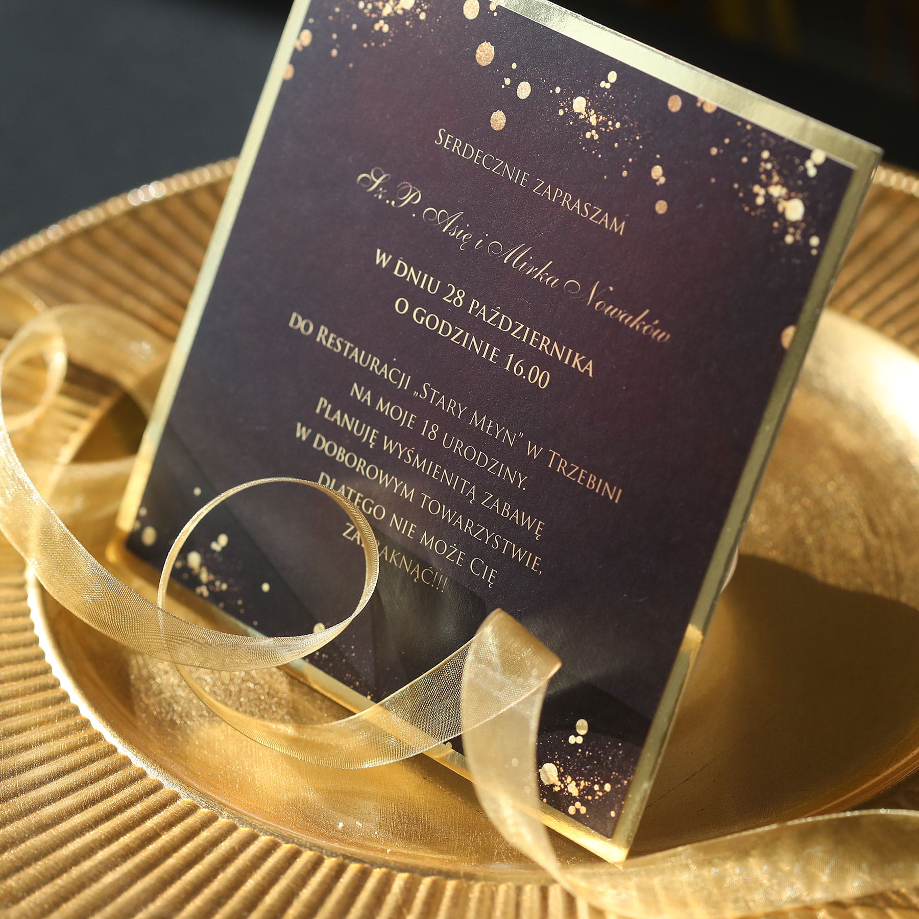 Bordowo-złote zaproszenia na 18 urodziny