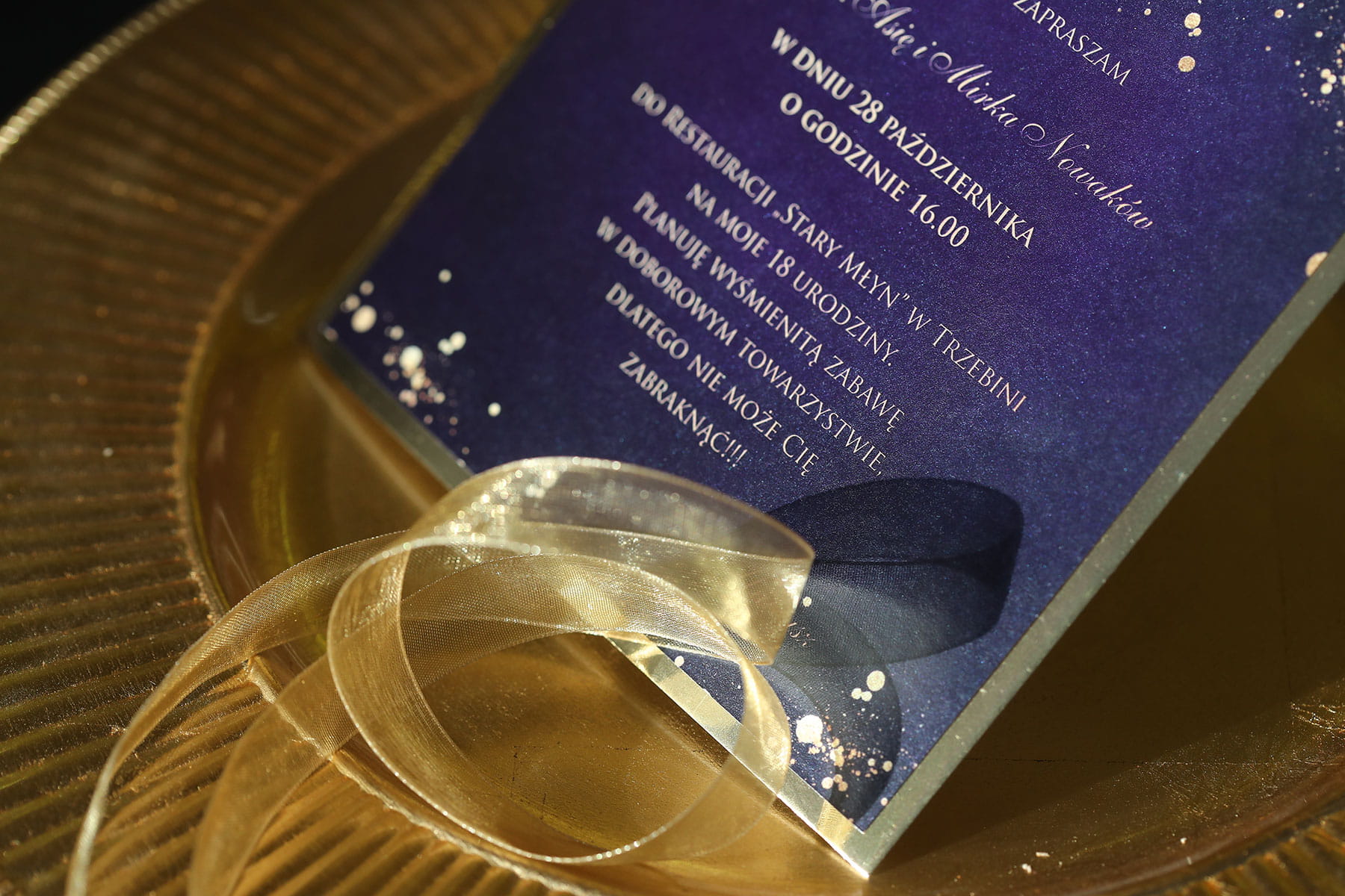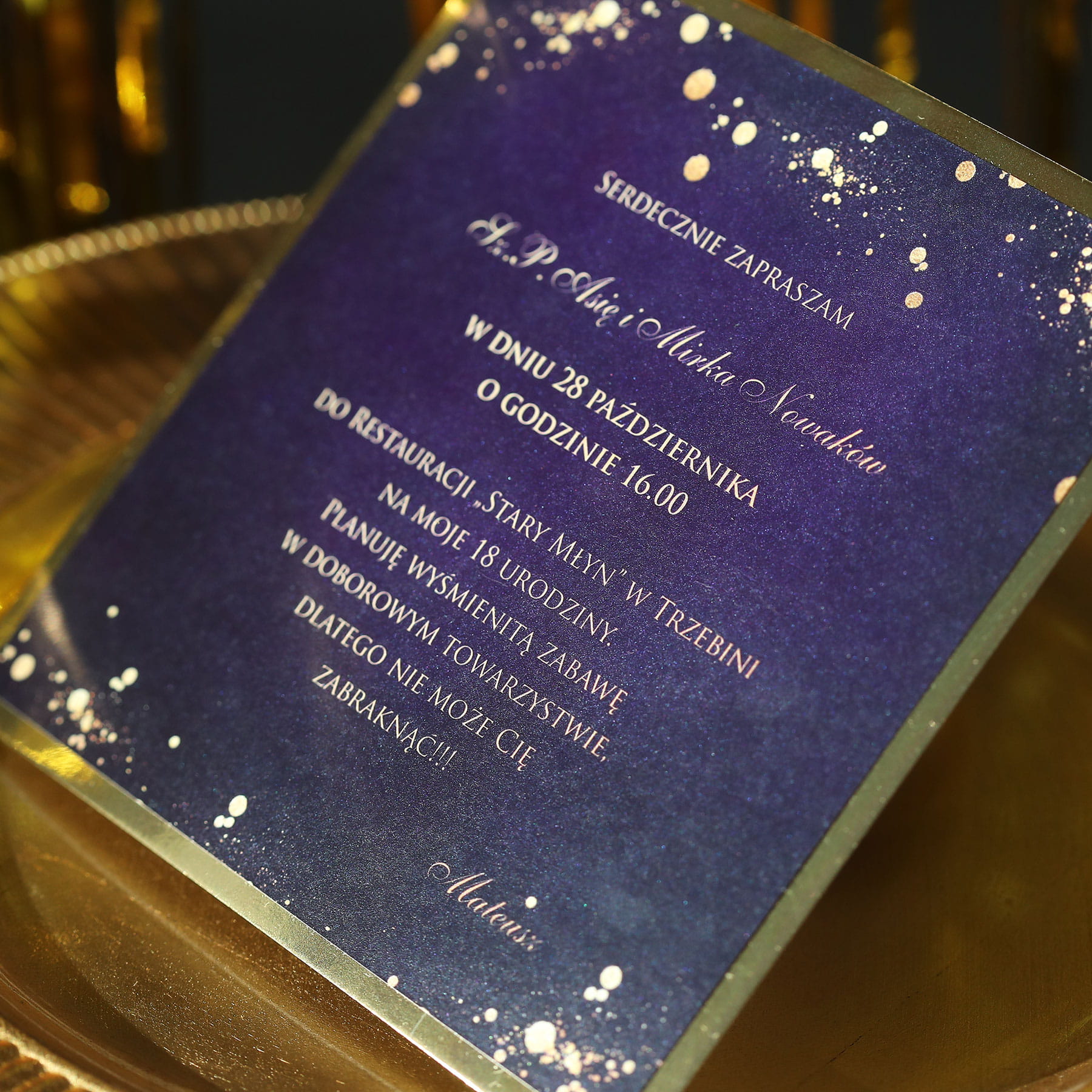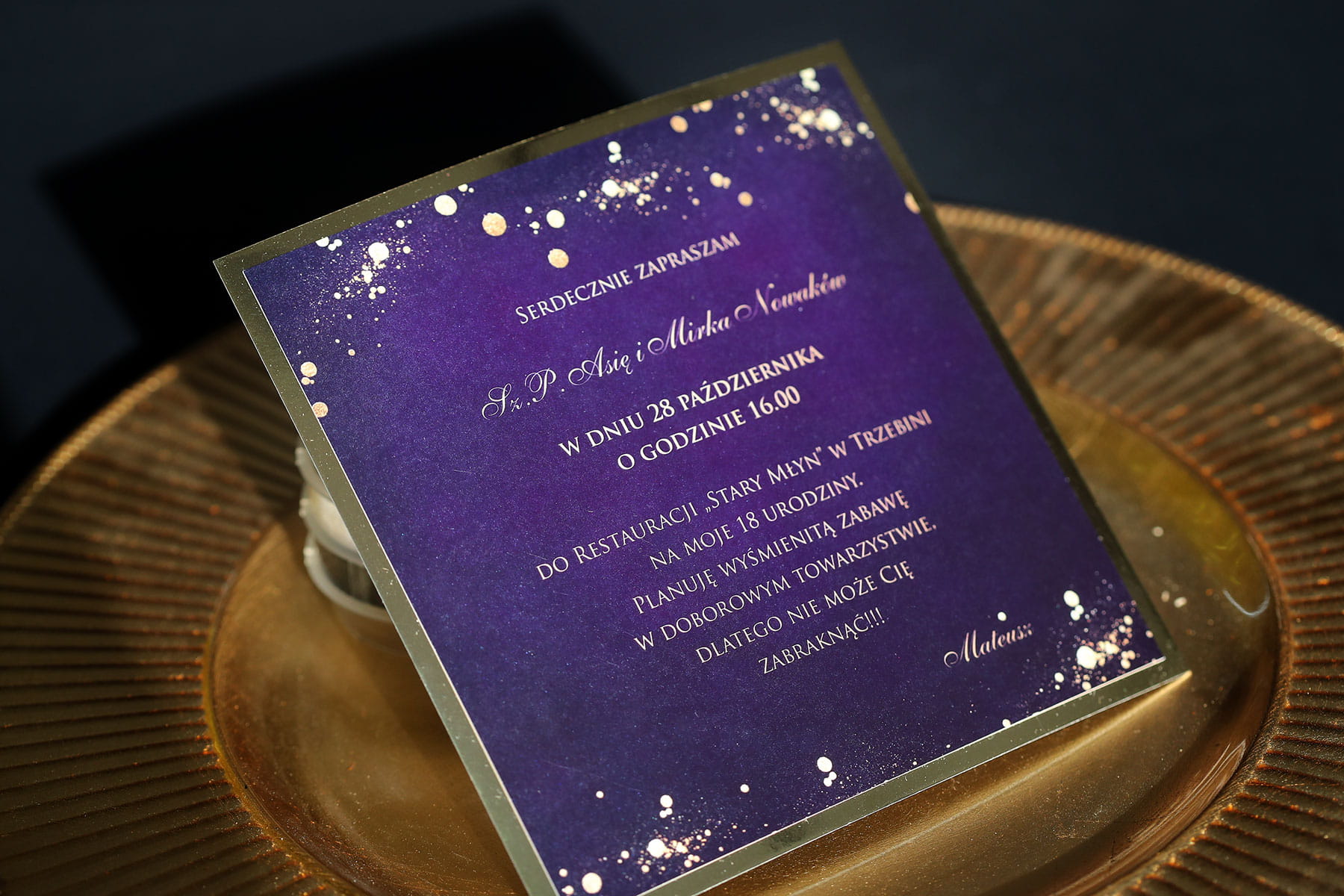 Fioletowo-złote zaproszenia na 18 urodziny