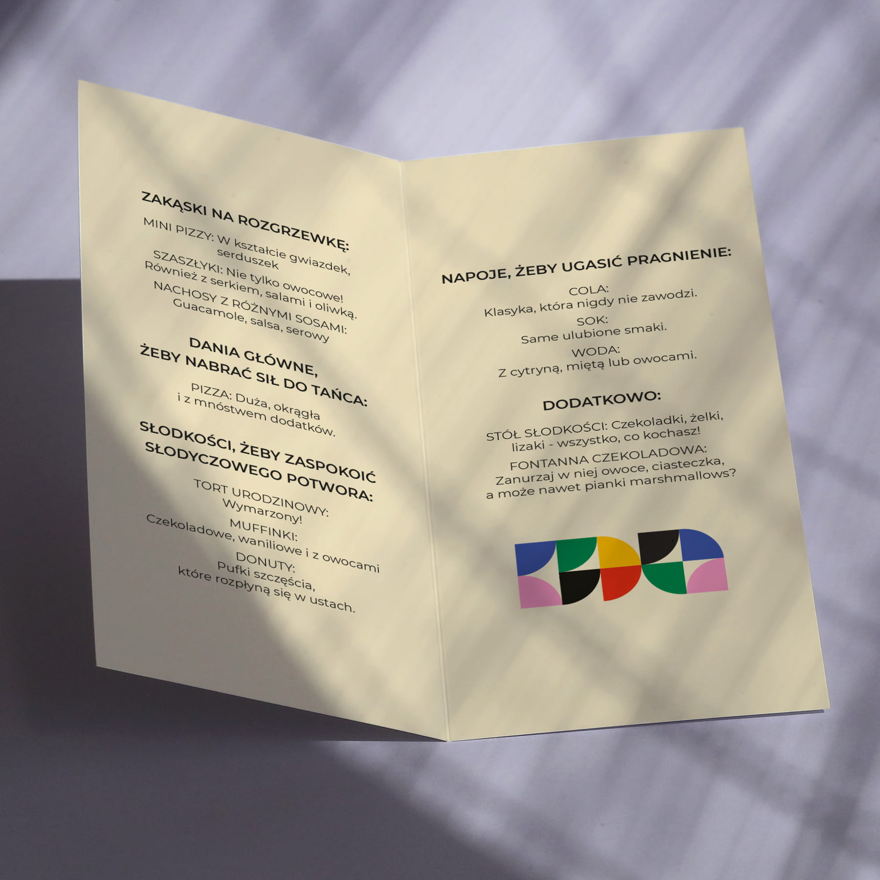 Karty menu na przyjęcie z kolorowym wzorkiem