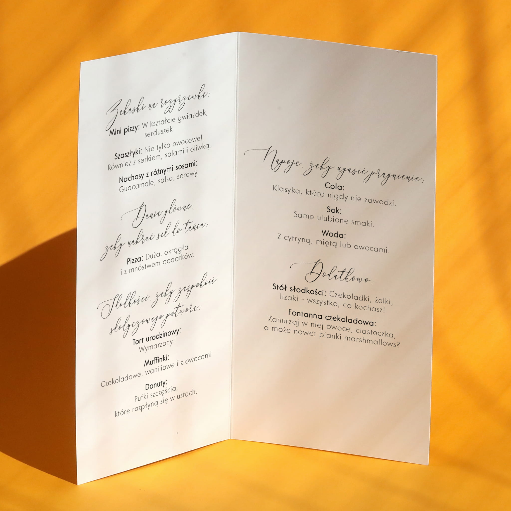 - Różnorodność formatów: Dostosujemy rozmiar karty menu do ilości dań i stylu Twoich urodzin.