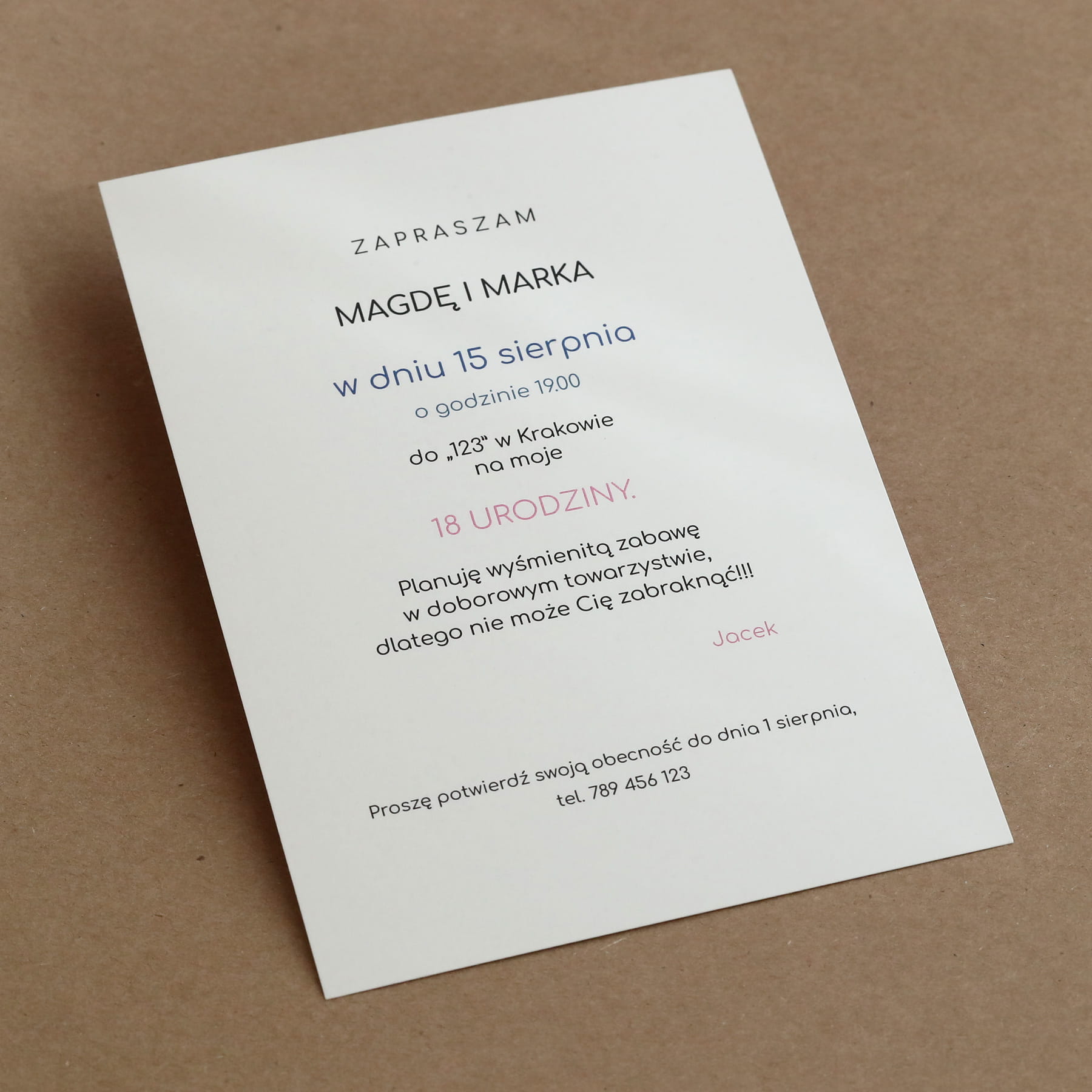 - To zaproszenie jest jednokartkowe, zadrukowane z obu stron.