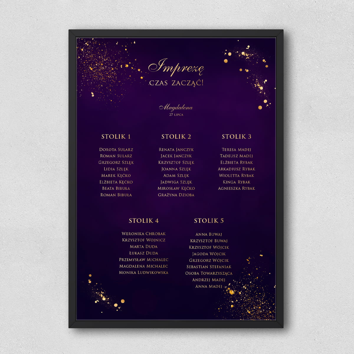 Plan stołów przyjęcia urodzinowego fioletowo-złoty