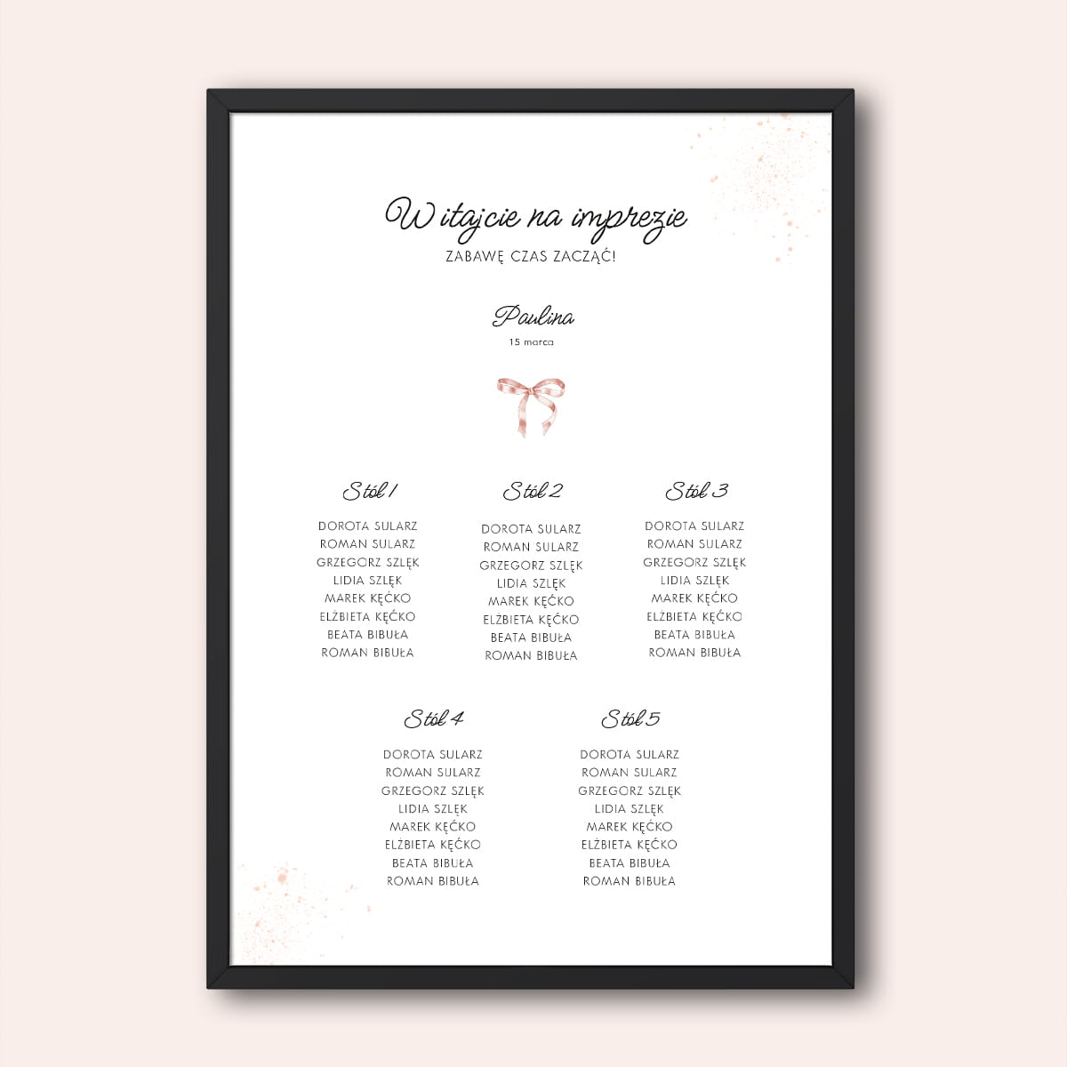 - Personalizacja: Wstawimy Twoją listę gości w nasz szablon.
