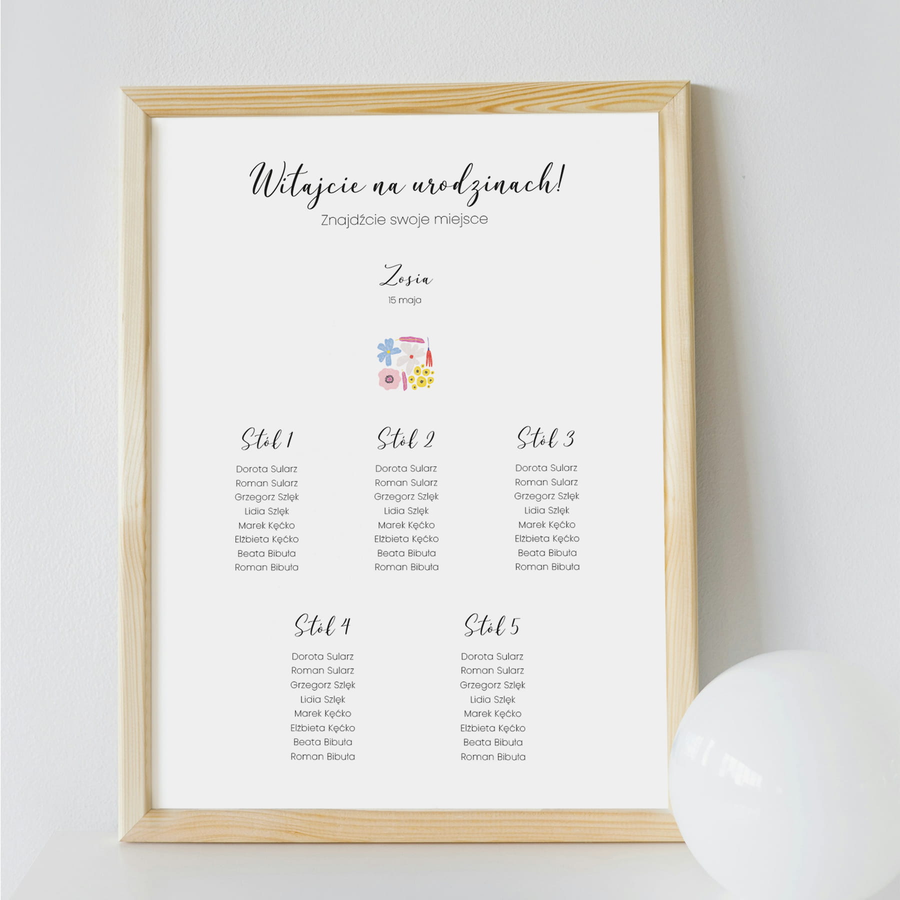 Plan stołu urodzinowego z kolorowymi kwiatami