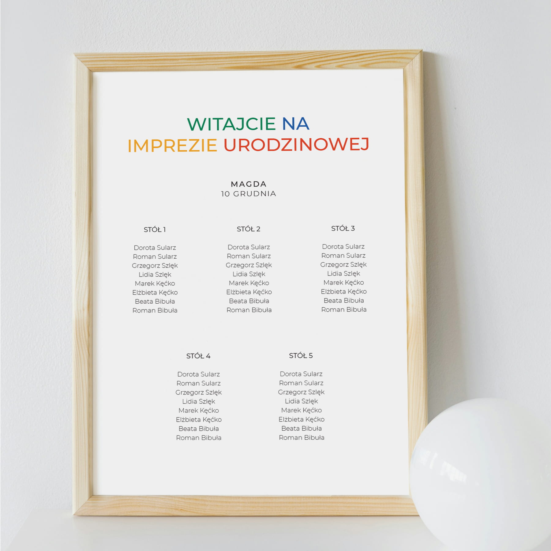 Plan stołu urodzinowego z kolorowymi napisami