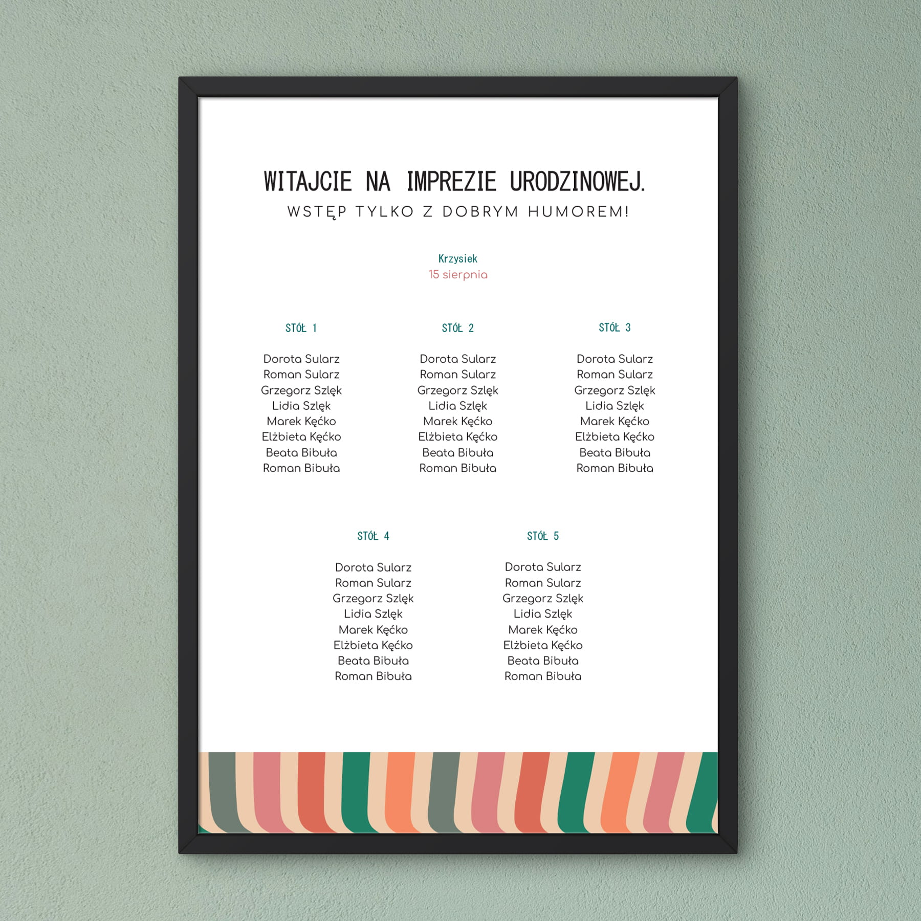 Plan stołów przyjęcia urodzinowego z kolorowymi paskami w stylu Bauhaus