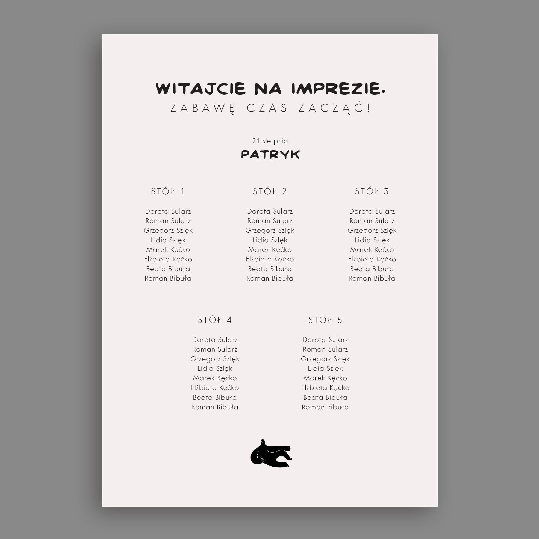 - Przygotuj listę: Przygotuj plik tekstowy, w którym goście są podzieleni na stoliki - dołącz go do zamówienia np.