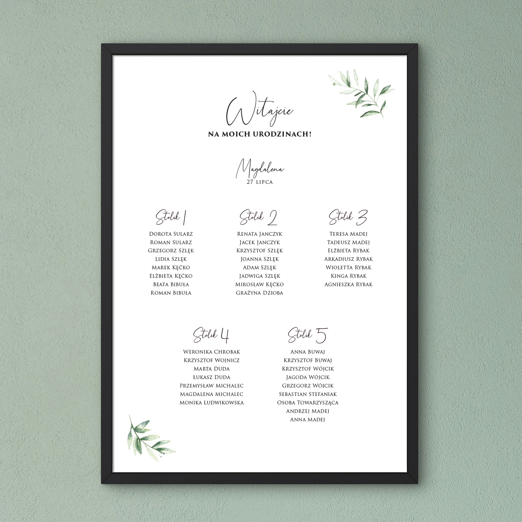 Plan stołów przyjęcia urodzinowego z delikatnymi, zielonymi liśćmi