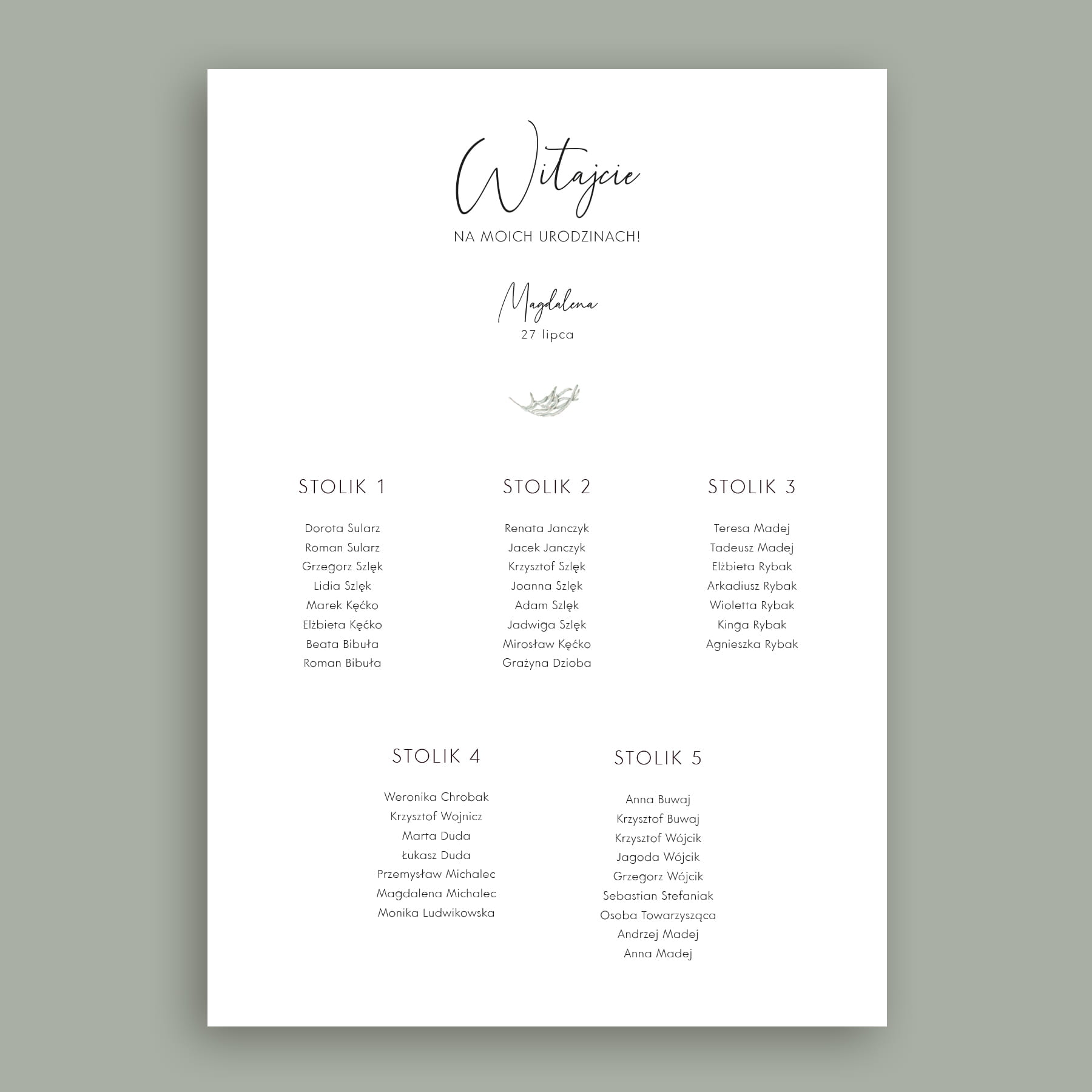 Plan stołów przyjęcia urodzinowego z delikatnym roślinnym motywem