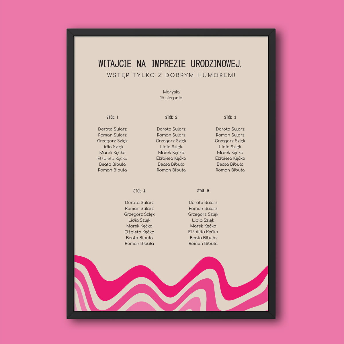 Plan stołu urodzinowego z różową falą