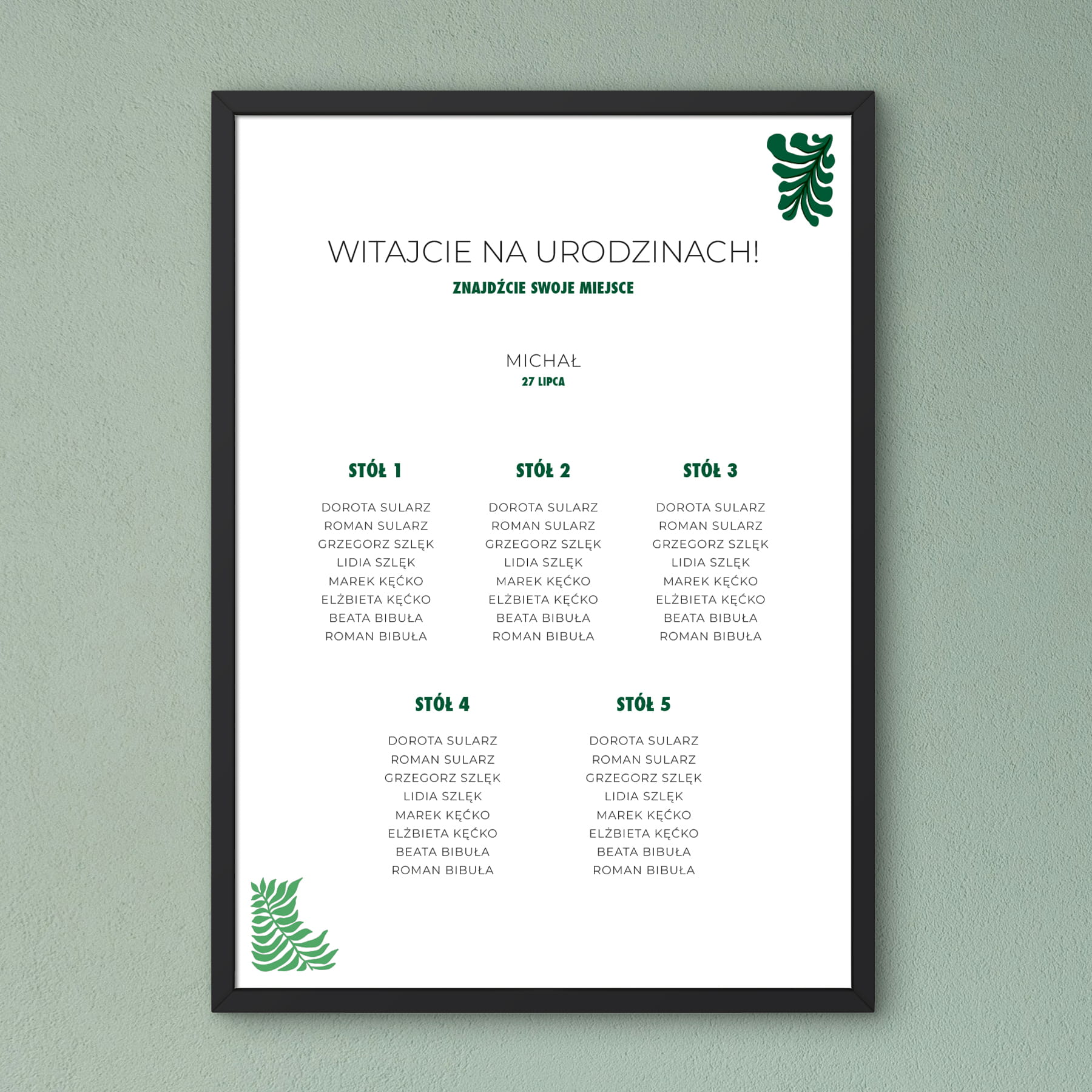 Plan stołów przyjęcia urodzinowego z zielonymi gałązkami