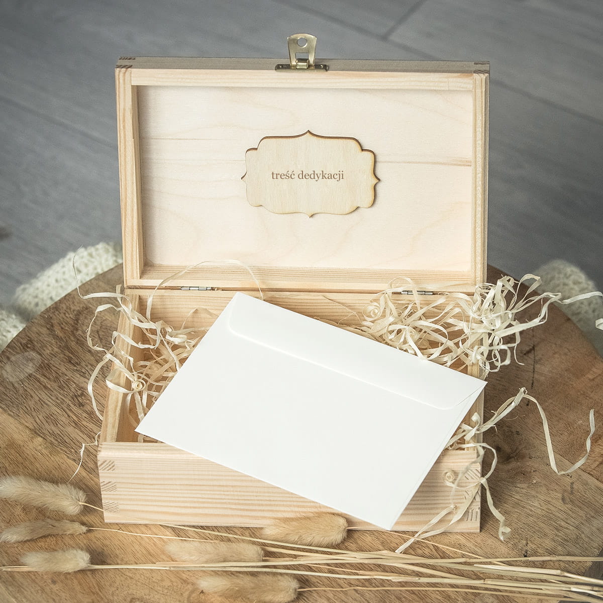 Pudełko ma wszystko, czego potrzebujesz. Indywidualny grawer, środek z dedykacją jeśli chcesz, wypełnienie w postaci sianka i koperty na banknoty.