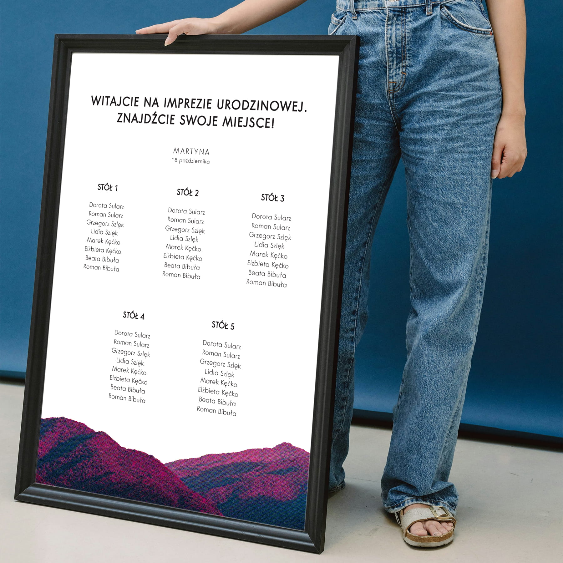 Retro plan stołów przyjęcia urodzinowego z fioletowymi górami