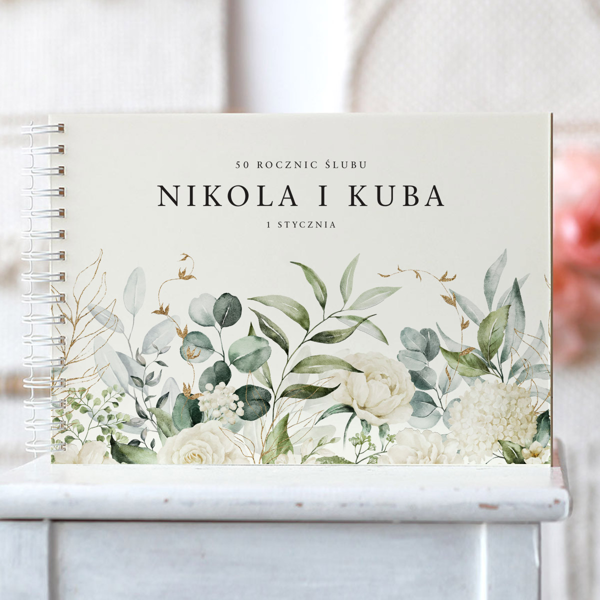 Na okładce znajduje się delikatna i elegancka grafika przedstawiająca białe kwiaty i gałązki eukaliptusa.