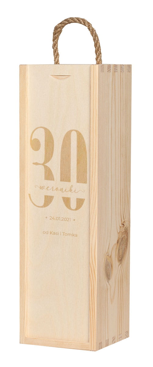 Drewniane pudełko na wino, z imieniem i datą urodzin jubilata.