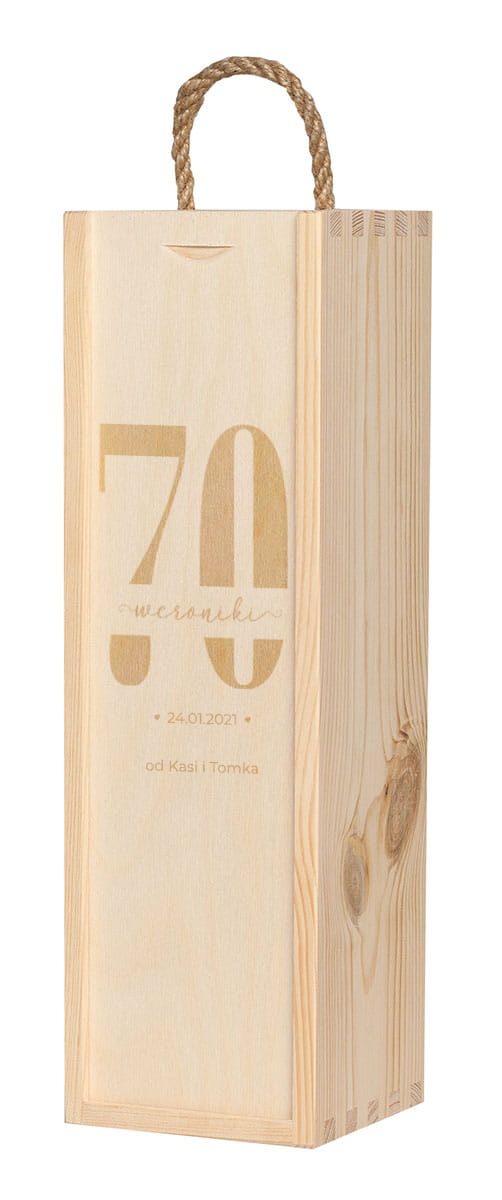 Drewniane pudełko na wino, z imieniem i datą urodzin jubilata.