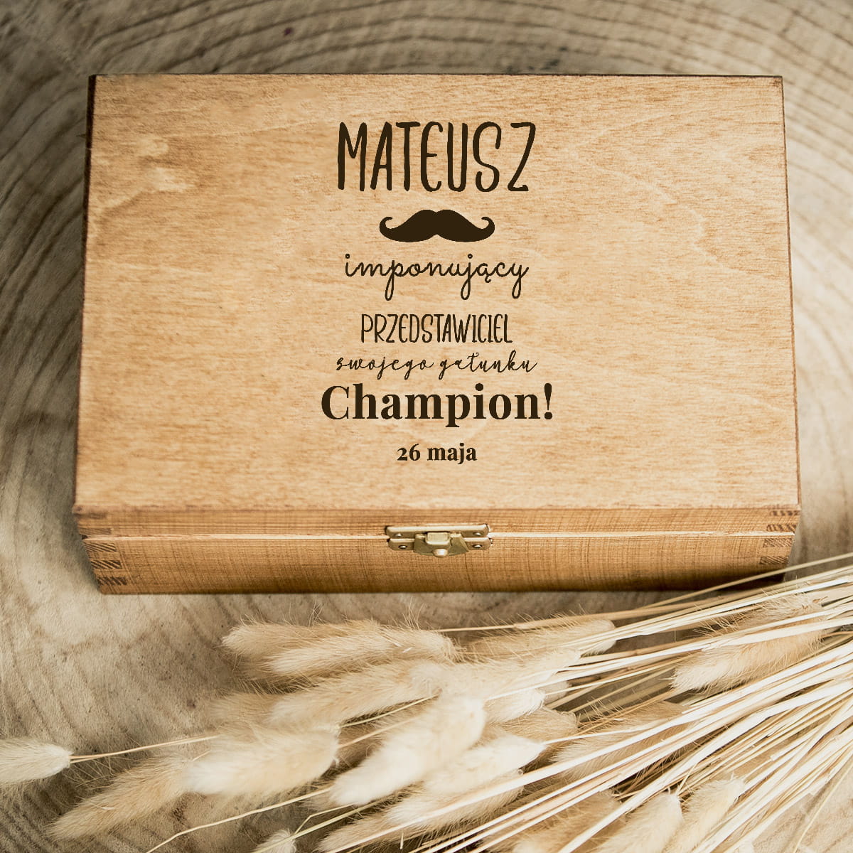 Wygląd zewnętrzny drewnianego pudełka z grawerem