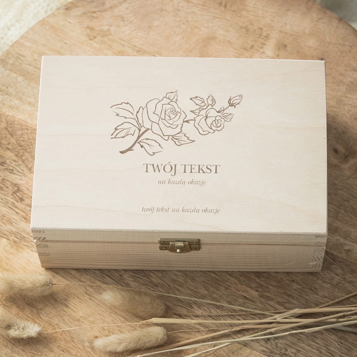Wygląd zewnętrzny drewnianego pudełka z grawerem