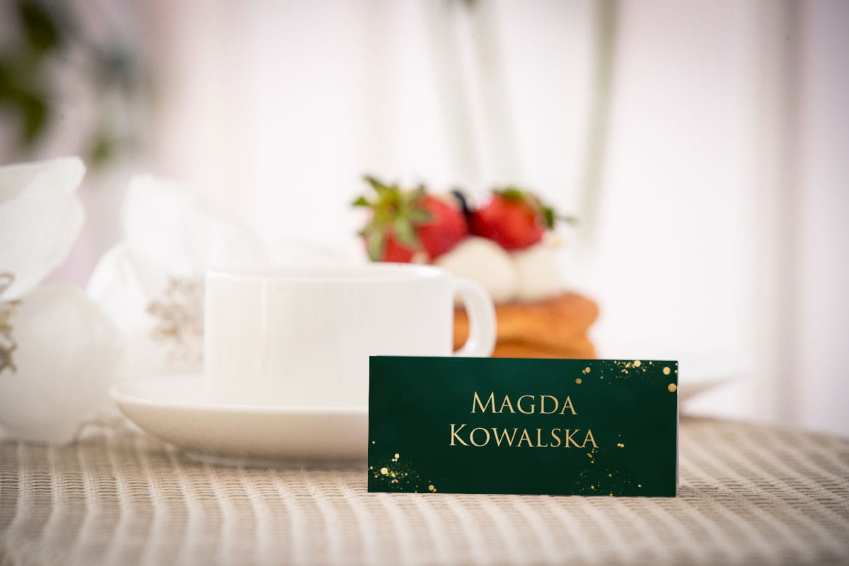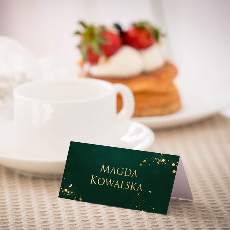 Piękne, eleganckie i szykowne winietki w ciemnozielonym kolorze z płatkami złota.