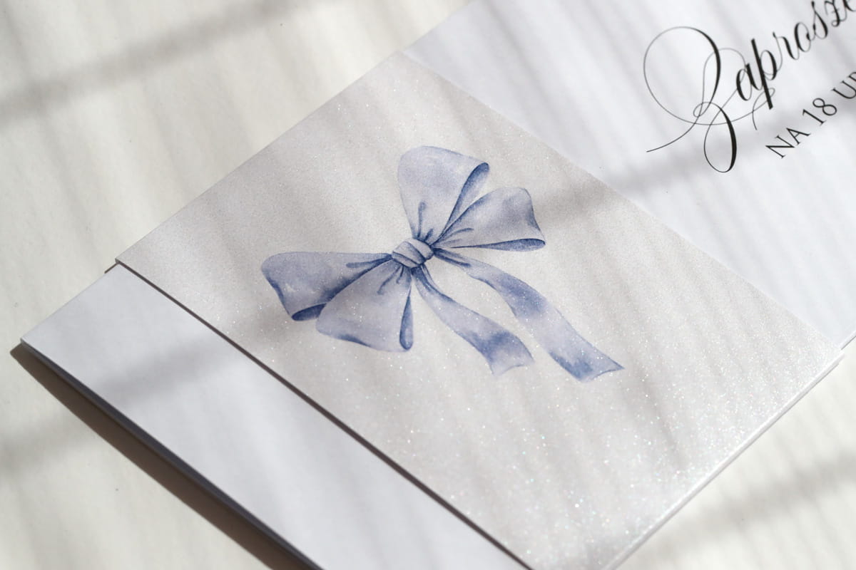 Zaproszenia urodzinowe z rozkoszną, niebieską kokardką