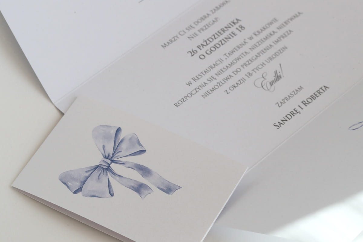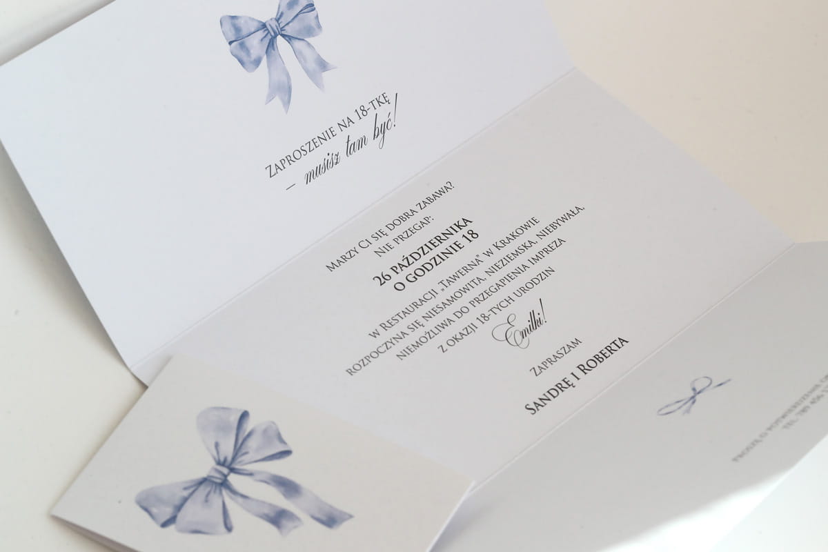 Zaproszenia na 18 urodziny z rozkoszną, niebieską kokardką