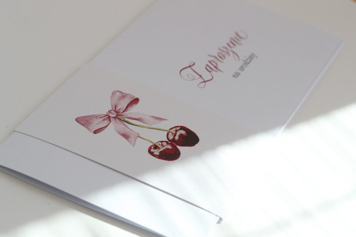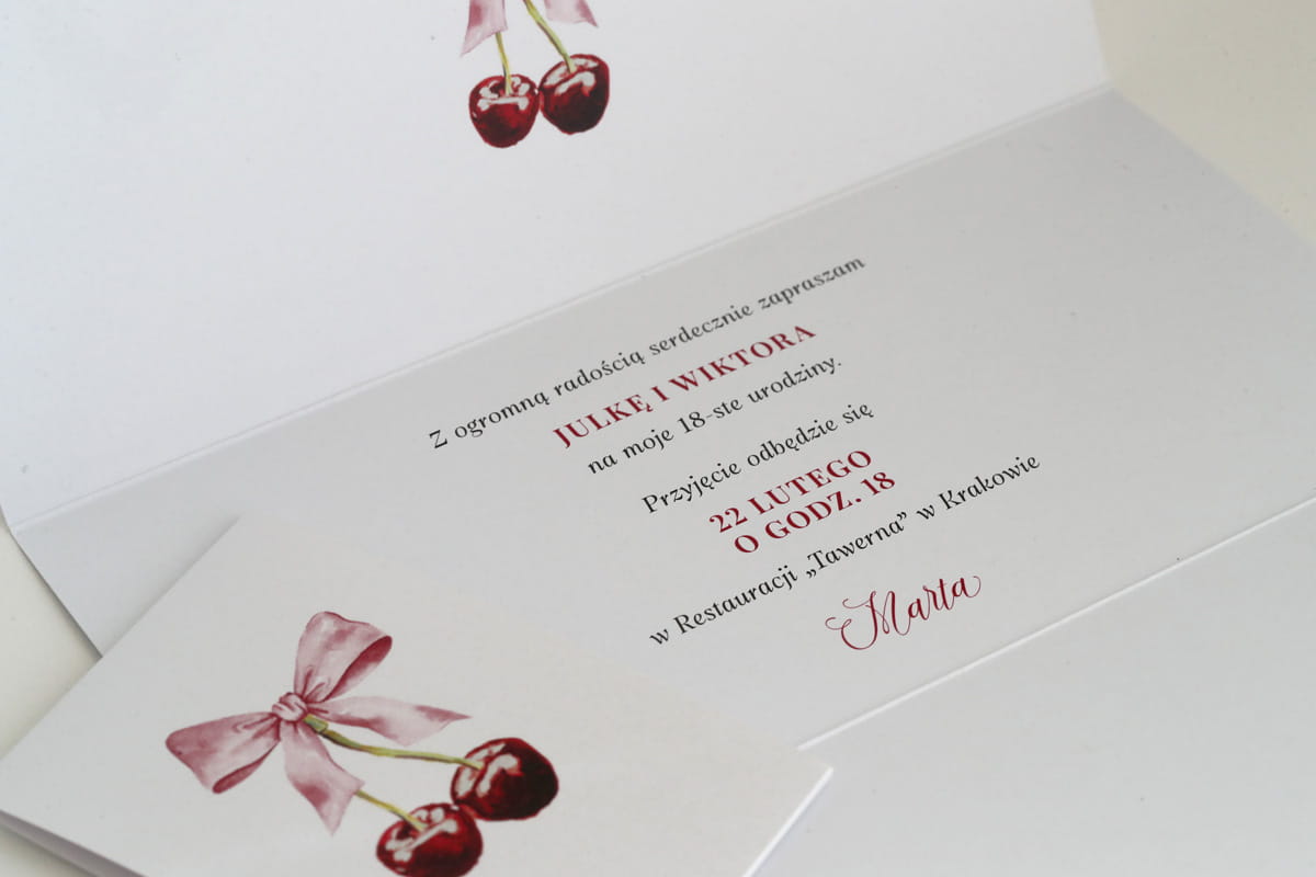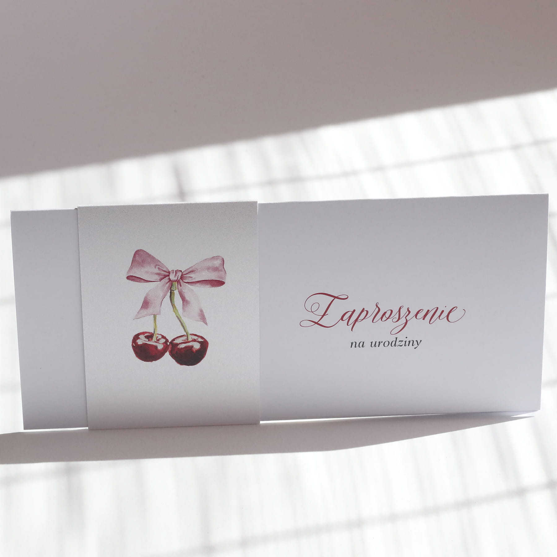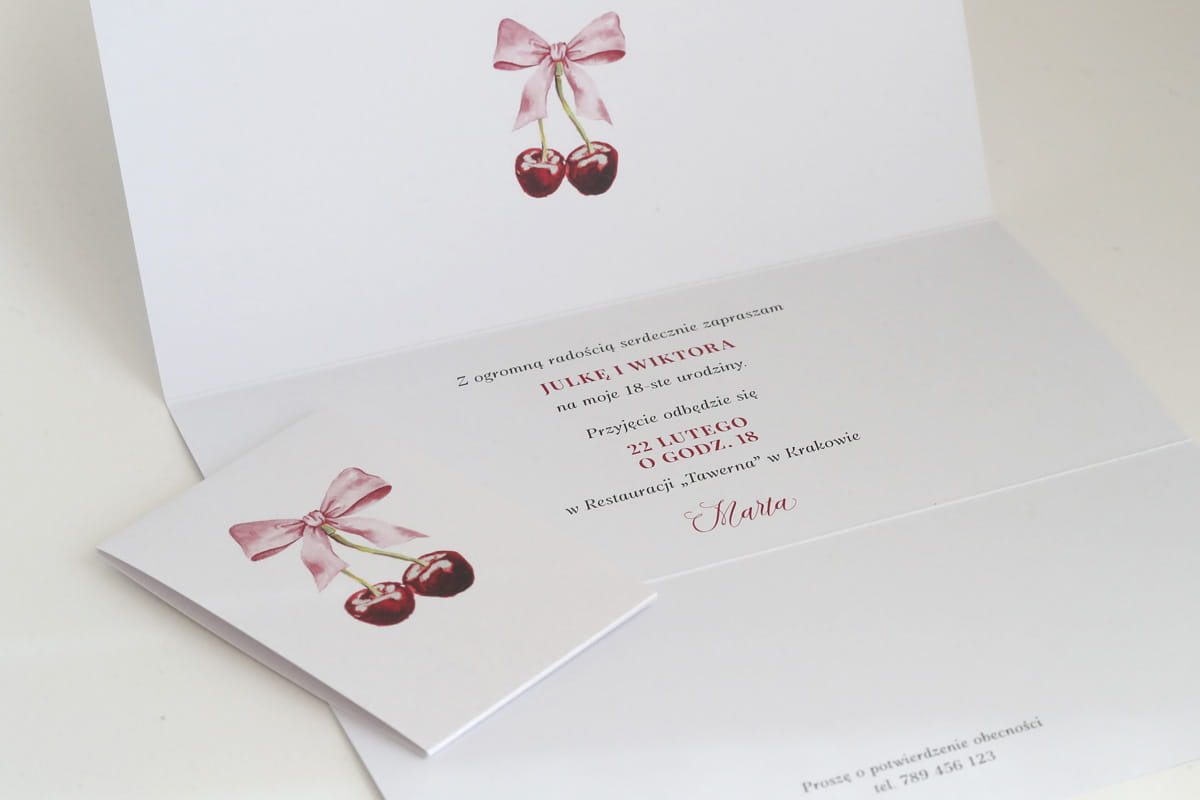 Zaproszenia urodzinowe z rozkoszną, różową kokardką i wisienkami