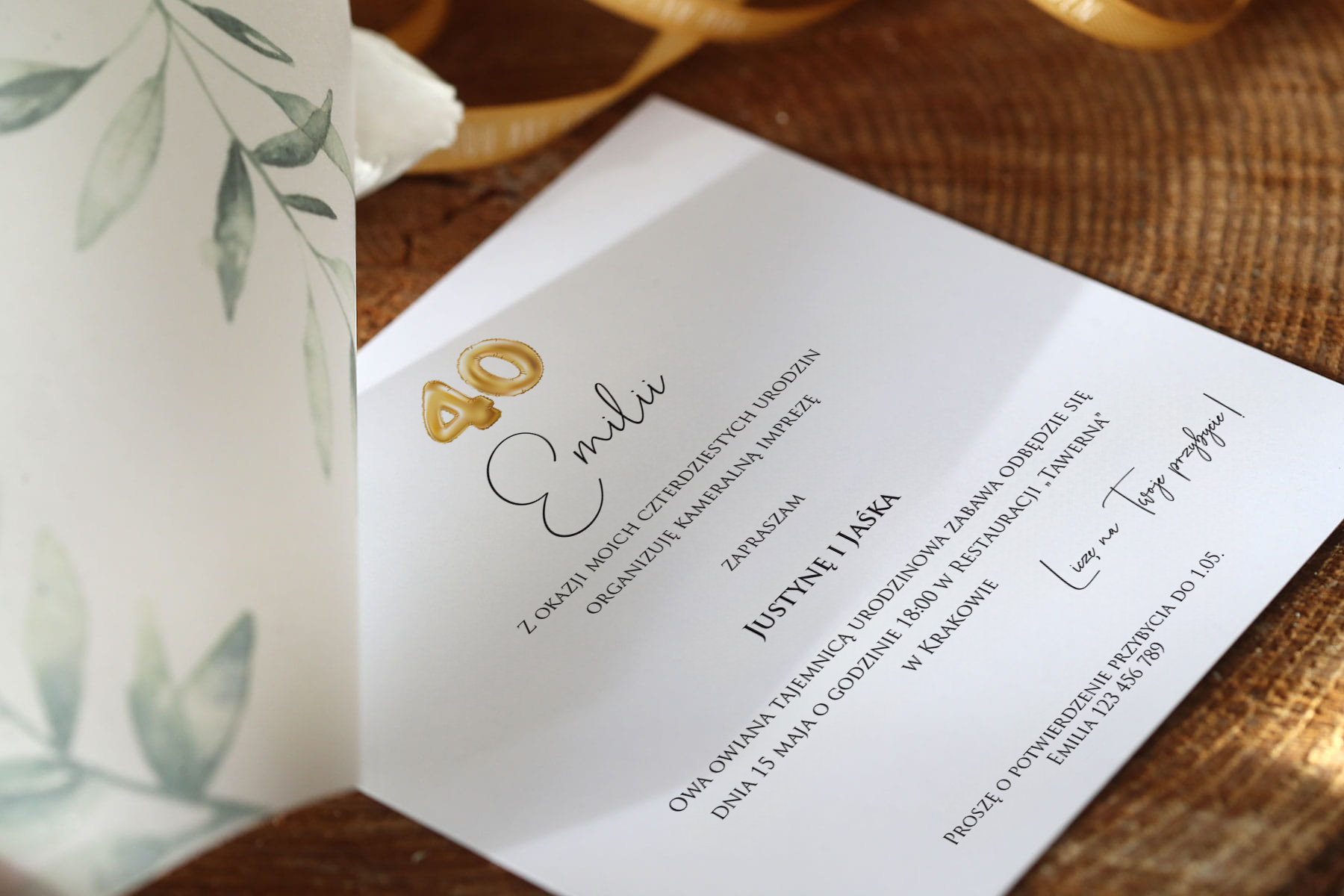 Zaproszenia z motywem delikatnych liści na 50 urodziny