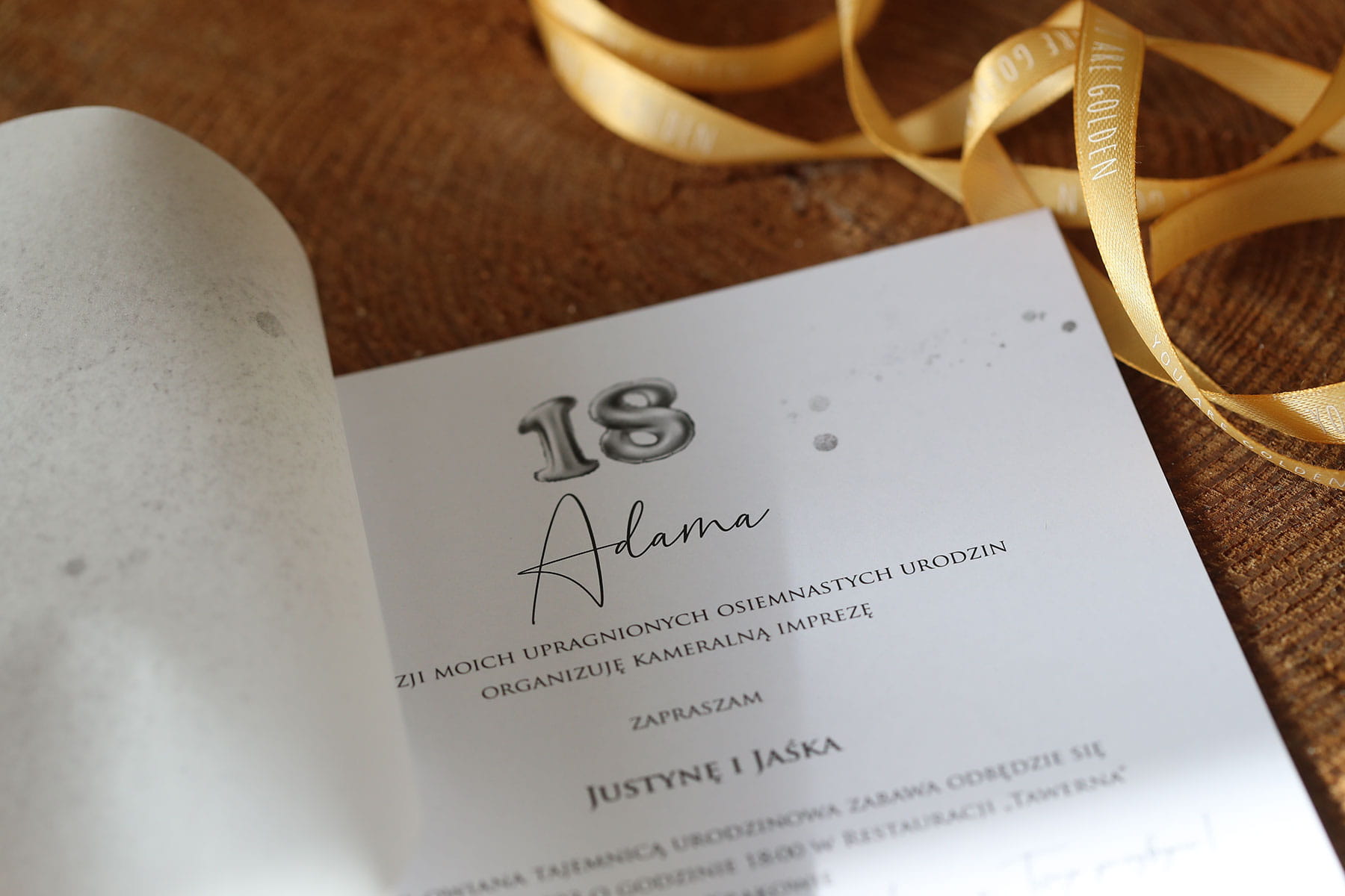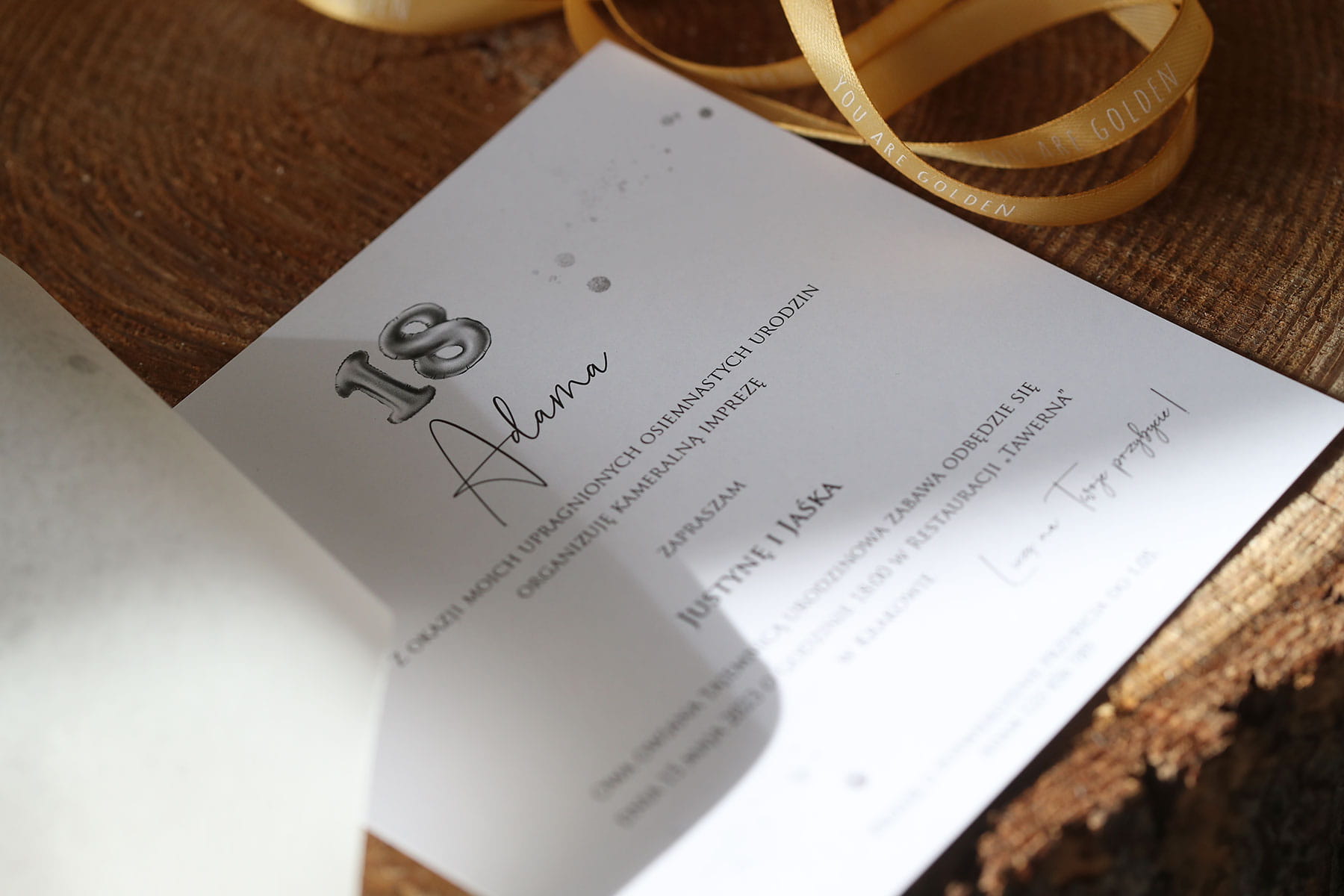 Tekst na zdjęciach jest przykładowy. Możesz przesłać nam dowolny tekst lub skorzystać z naszej bazy: Tutaj znajdziesz teksty zaproszeń na 18-ste urodziny >>> wybierz najlepszy dla siebie, uzupełnij swoimi danymi i dołącz go w formie tekstu do zamówienia.