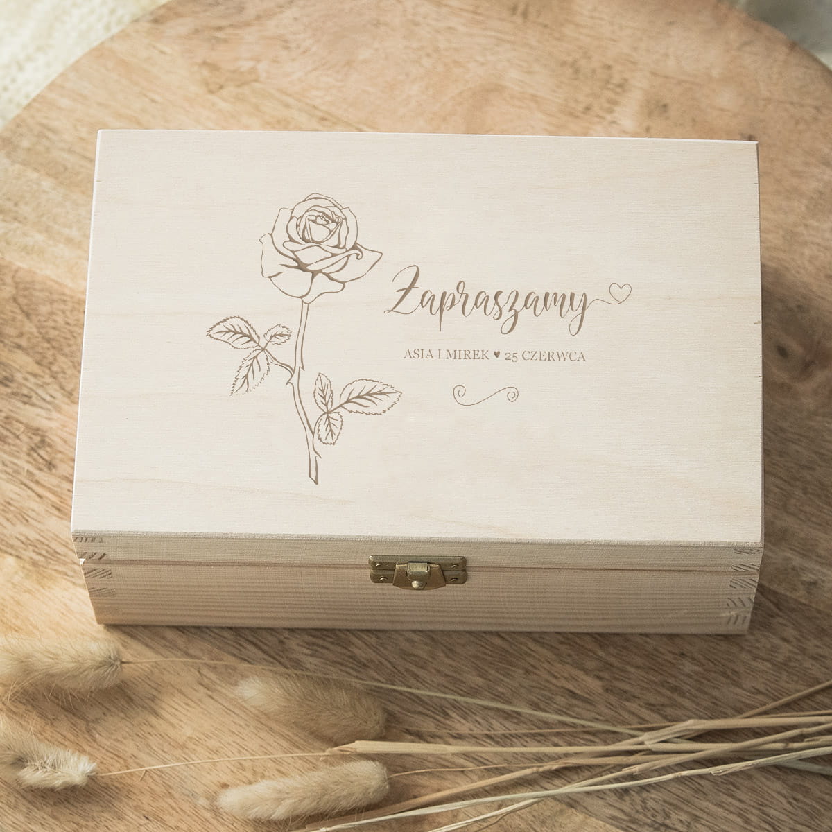 Piękne drewniane pudełko na prezent dla Rodziców z motywem róży.