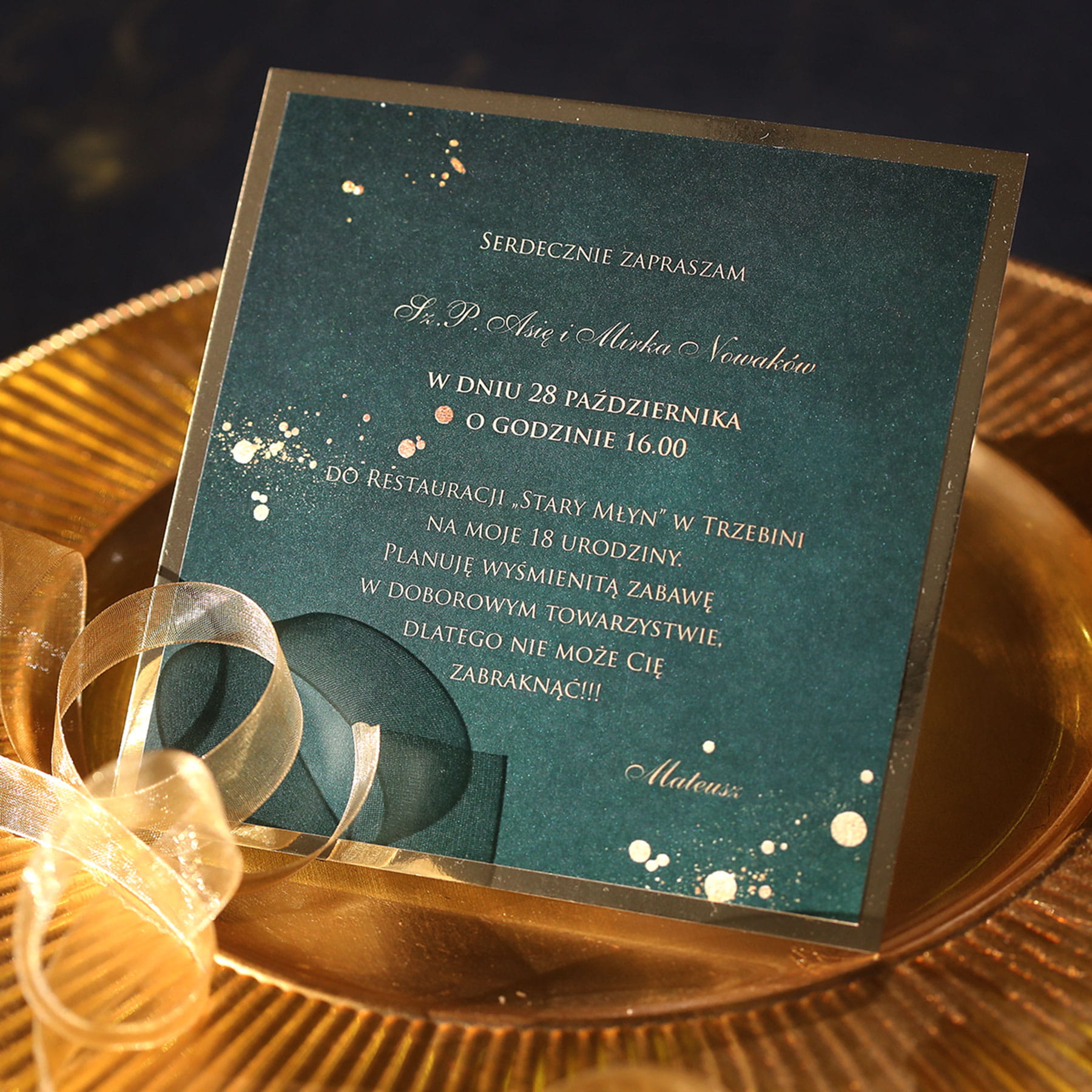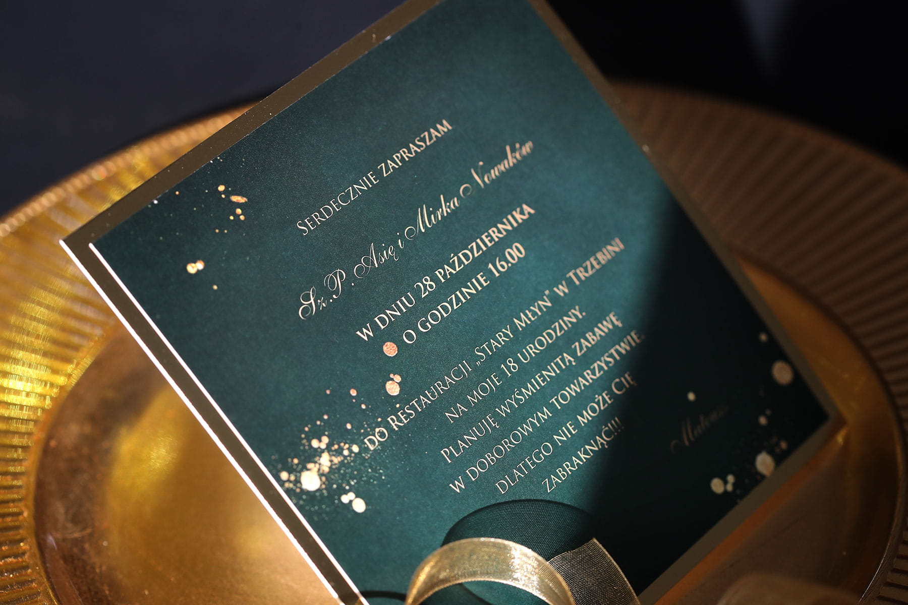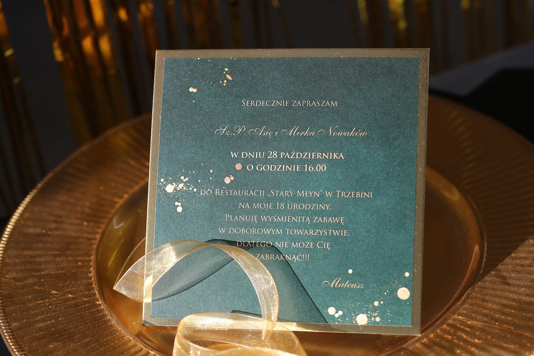 Złoto-szmaragdowe zaproszenia na 18 urodziny