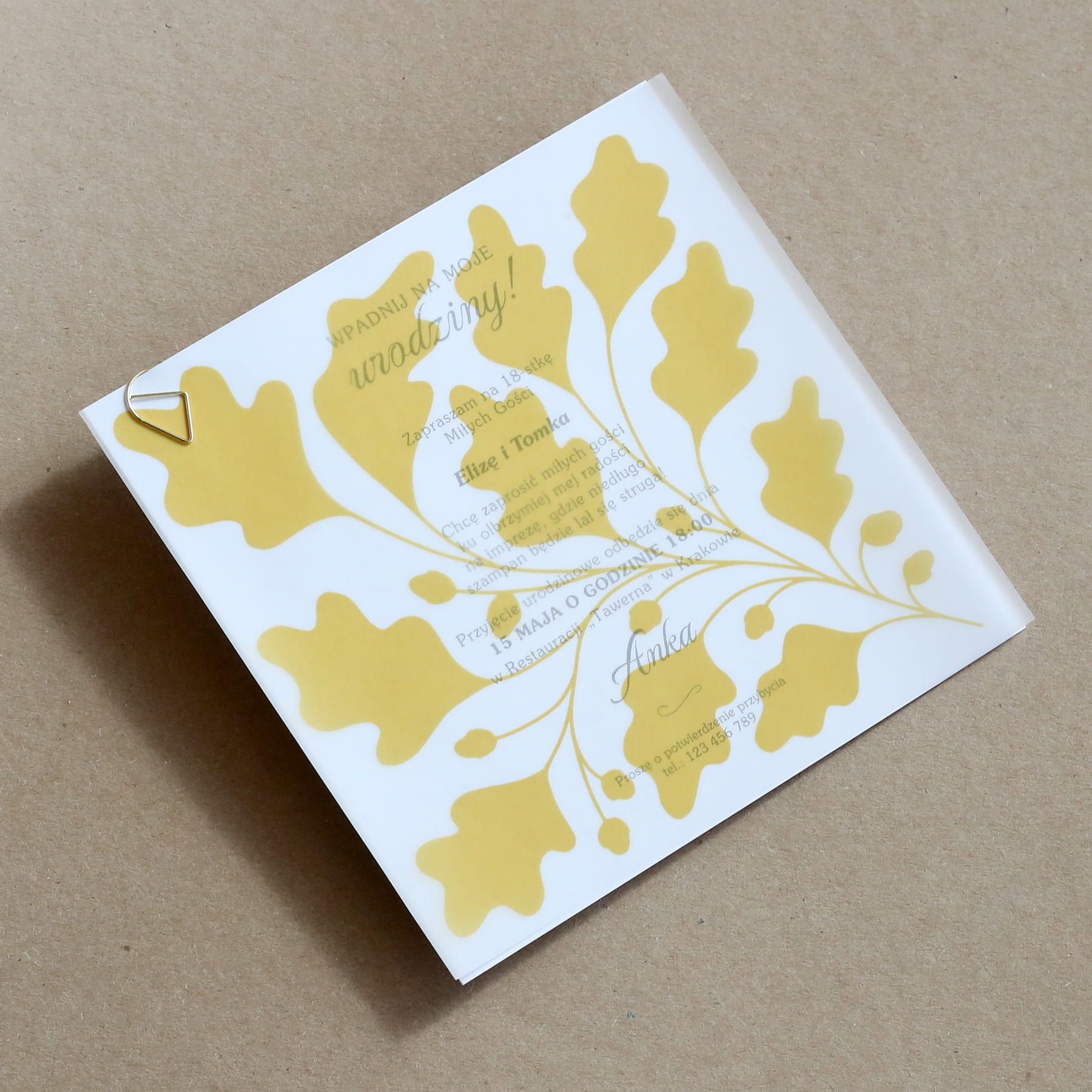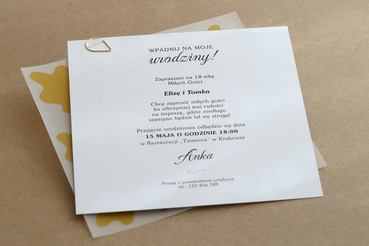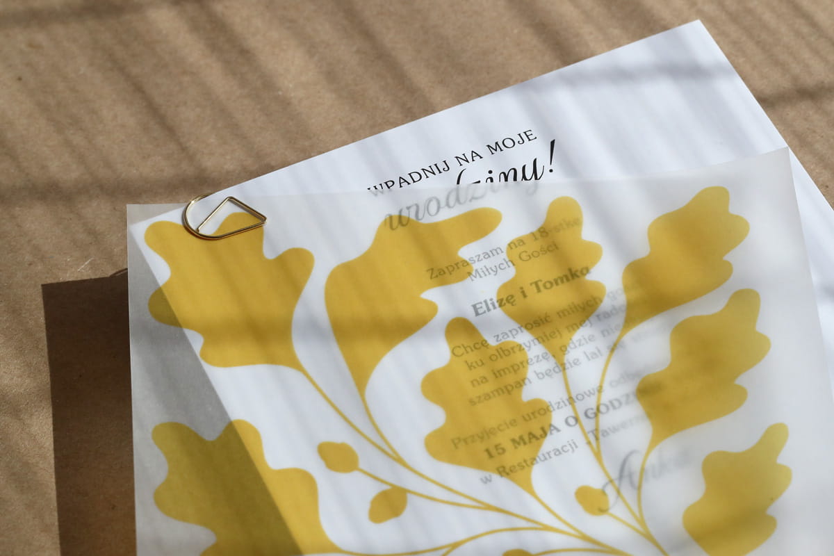 Żółte zaproszenia na 18 urodziny z ozdobną kalką